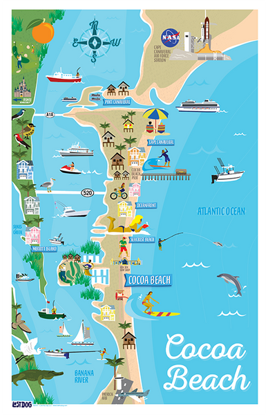 Cocoa Beach, FL Illustrated Map โ LOST DOG Art & Frame